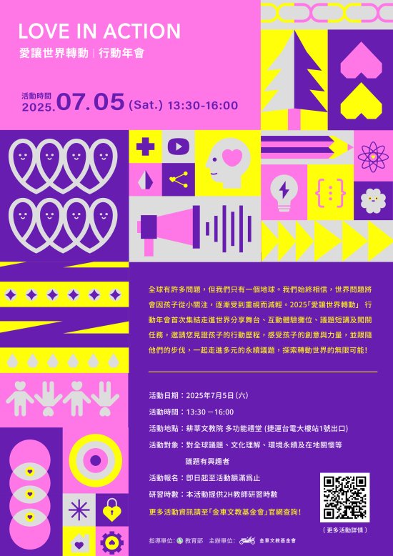 | 一、 | 金車文教基金會長期推動「愛讓世界轉動」計畫,鼓勵老師陪伴孩子以國際視野、在地行動,走出教室落實社會關懷。2025「愛讓世界轉動」行動年會活動特別集結獲獎團隊師生行動成果,現場設有15個互動體驗攤位、4大議題專家短講及闖關任務等豐富活動,教您如何透過教學設計與課堂實踐,連結在地與國際重要的永續議題,打造有感的學習氛圍,攜手孩子走進地方、邁向世界。 |