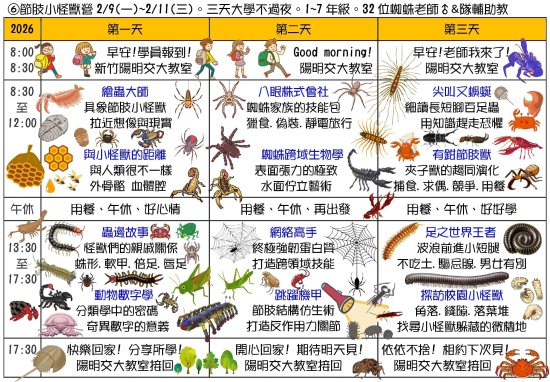 | 轉知寒假辦理「2026生態素養冬令營」暨參展「2026臺灣國際昆蟲博覽會」等共三種活動。 |