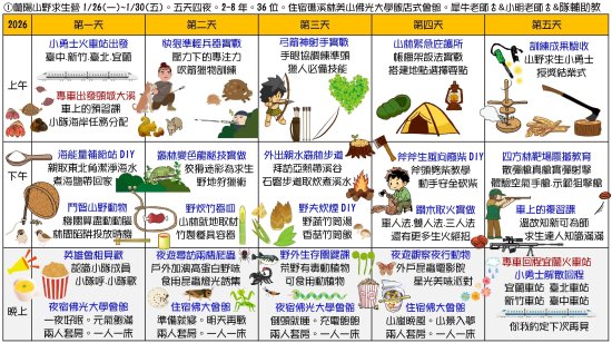課程主題:①蘭陽山野求生營(5天4夜)、②小琉球海龜營(5天4夜)、③宜蘭生態農場營(3天2夜)、④TPE博物館生態營(3天外出不過夜)、⑤屏東柚園攀樹營(3天外出不過夜)、⑥節肢小怪獸營(3天大學不過夜)、⑦池上單車生態營(4天3夜)。 |