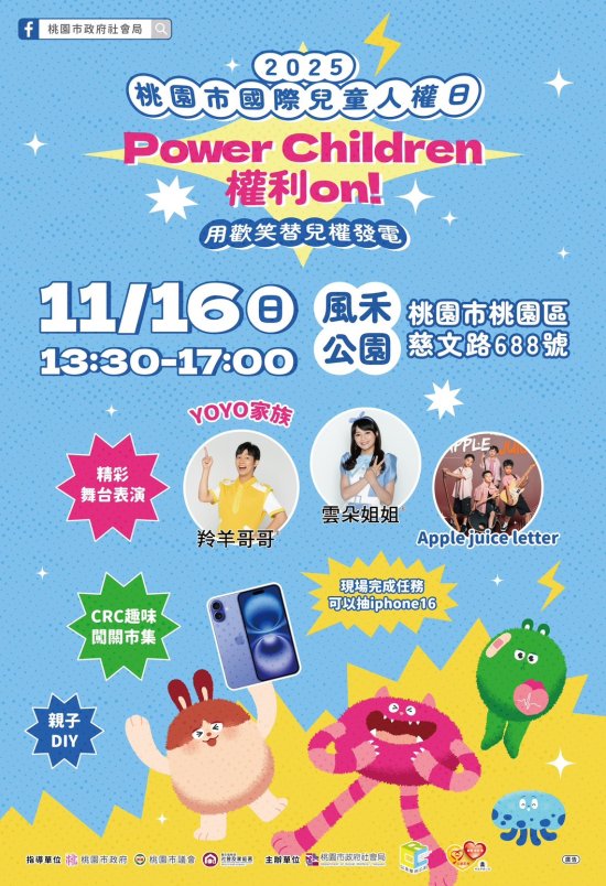 | 二、 | 旨案活動定於114年11月16日(星期日)下午1時30分至17時假風禾公園(桃園市桃園區慈文路688號)辦理。 |
