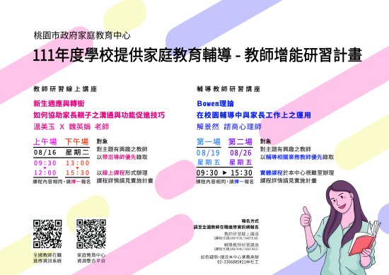 為因應「家庭教育法」及「桃園市高級中等以下學校提供家庭教育諮商或輔導辦法」修正,提升高級中等以下學校之教師提供家庭教育輔導之能力,並強化親師間之溝通效能與品質,爰辦理旨案計畫。 |