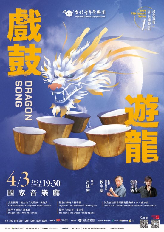 一、 | 2024台北青管定期音樂會系列I,由侯宇彪教授指揮台北青年管樂團演出;帶來多首與東西方神獸龍有關之樂曲,氣勢磅礡。並邀請廣州交響樂團定音鼓首席張立德擔任協奏曲獨奏,精彩可期。 |