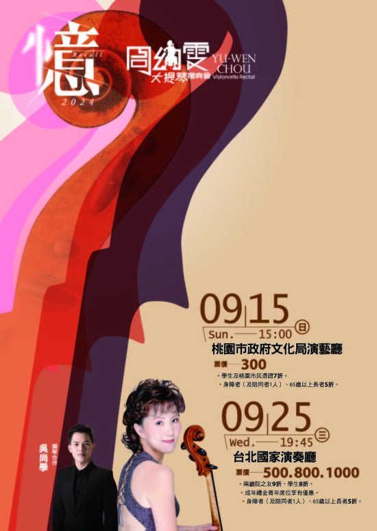 二、 | 大提琴演奏家周幼雯教授,現職為國家交響管樂團團員,並擔任實踐大學、台北市立教育大學、私立中國文化大學及國立台灣藝術大學等音樂系及研究所兼任教授,並長期於桃園深耕藝術教育推廣。 |