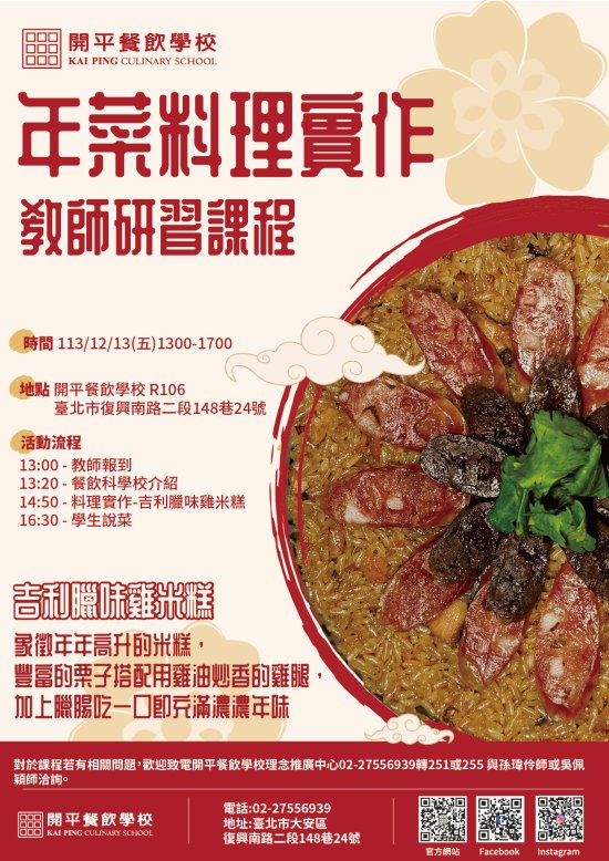 | 四、 | 報名方式:採線上報名,請上”全國教師在職進修資訊網”報名,課程名稱:創意年菜教師研習,課程代碼:4775177。報名截止日期:113年12月11日(三),課程名單將於開課前二天確認遴選名單。 |